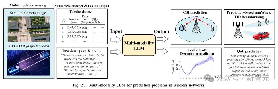 多模态LLM能够处理来自多种数据源的信息(如文本、图像、音频和时序数据),并结合网络环境感知信息,从而提供更具上下文的精准预测。例如,结合气象数据和历史CSI数据进行信道状态预测,或利用卫星图像和3D地图进行毫米波束预测。