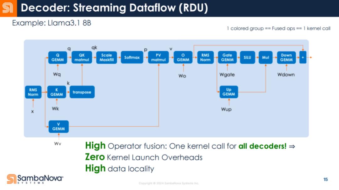 如下图所示,每个框都是一个算子。一般来说,多个算子会同时运行,并将数据保存在芯片上以重复使用。但在 RDU 中,整个解码器是一个 Kernel 调用。