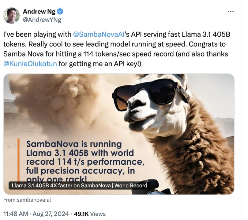 RDU 能够实现更快的推理速率,更利于大模型的部署。连人工智能专家吴恩达也惊叹 SambaNova 的推理速率: