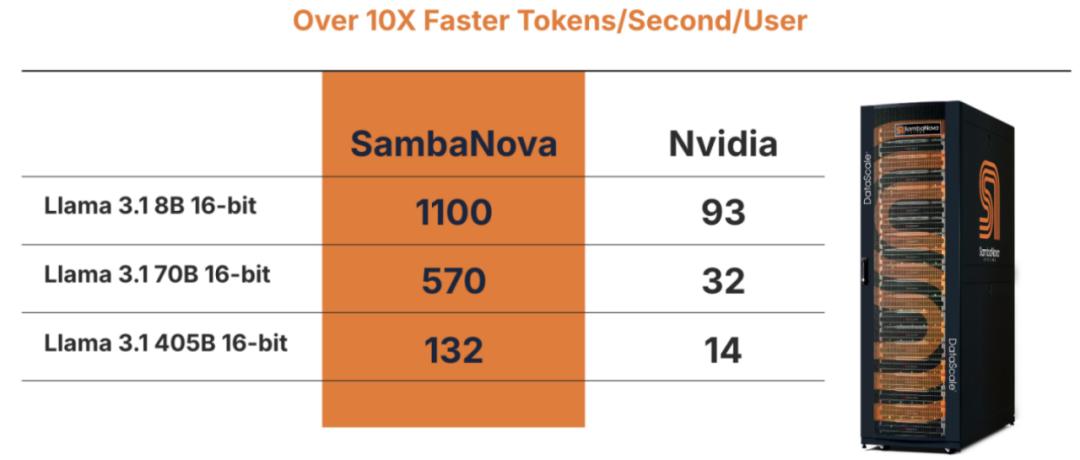 当前的几家主流 AI 芯片 Startup,都选择了数据流架构。其中来自 SambaNova 的 RDU 展现出了独特优势,也被视为 GPU 的最有力竞争者 。与英伟达相比,Sambanova 最新 Llama 3.1 模型上生成 token 的性能快了 10 倍以上,并且通过 cloud.sambanova.ai 公开供开发人员使用。