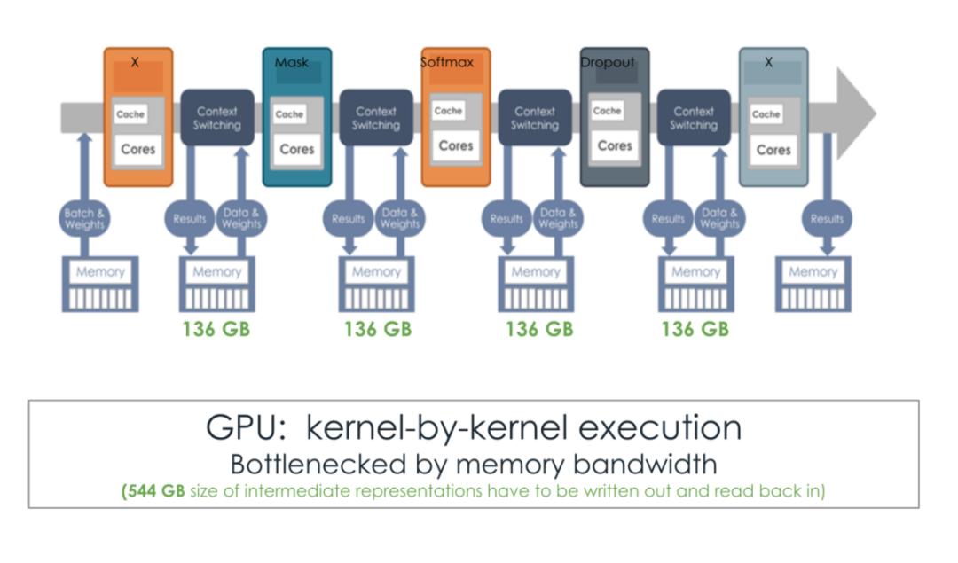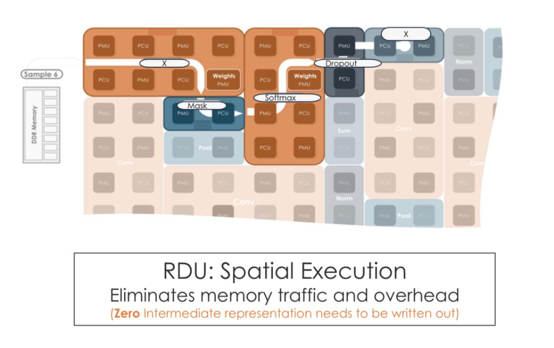 从下图可以看到,SambaNova RDU 的片上空间数据流可以做自动的算子融合 (kernel fusion),与 GPU 的传统 kernel-by-kernel 运行相比,明显消除了大量的内存流量和开销。