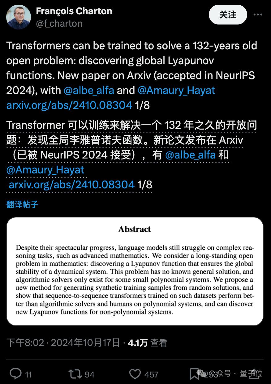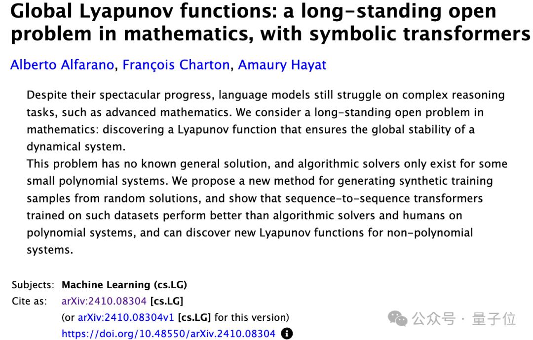 作者Meta科学家François Charto表示,尽管Symbolic Transformer像其他AI模型一样还是一个黑盒系统,但它给出的李雅普诺夫函数是明确的符号表达式,完全可以经受数学证明的检验。