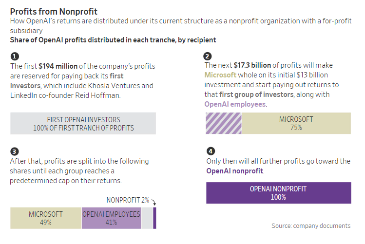 据《华尔街日报》,微软和 OpenAI 已聘请投资银行帮助确定 OpenAI 向营利性公司转型的股权分配方案同时解决反垄断问题,高盛和摩根士丹利分别为 OpenAI 和微软的高风险谈判提供咨询。