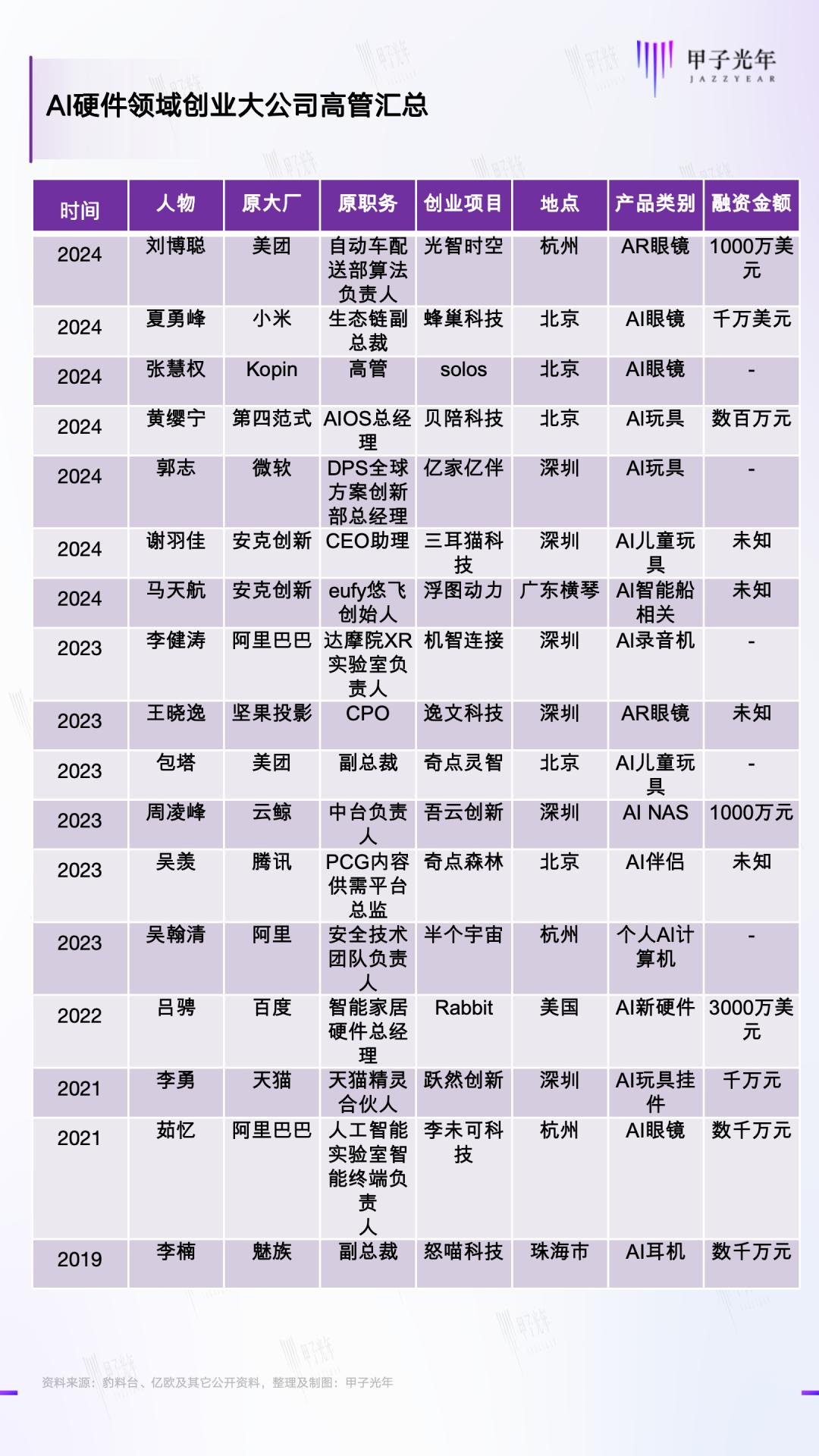 AI硬件领域大公司高管创业汇总,整理及制图:甲子光年