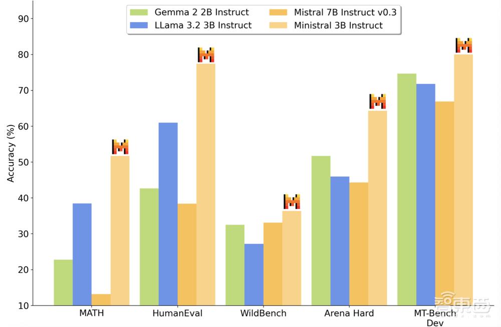▲Ministral 3B和Gemma 2 2B, Llama 3.2 3B,Mistral 7B性能的比较。(图源:Mistral AI)