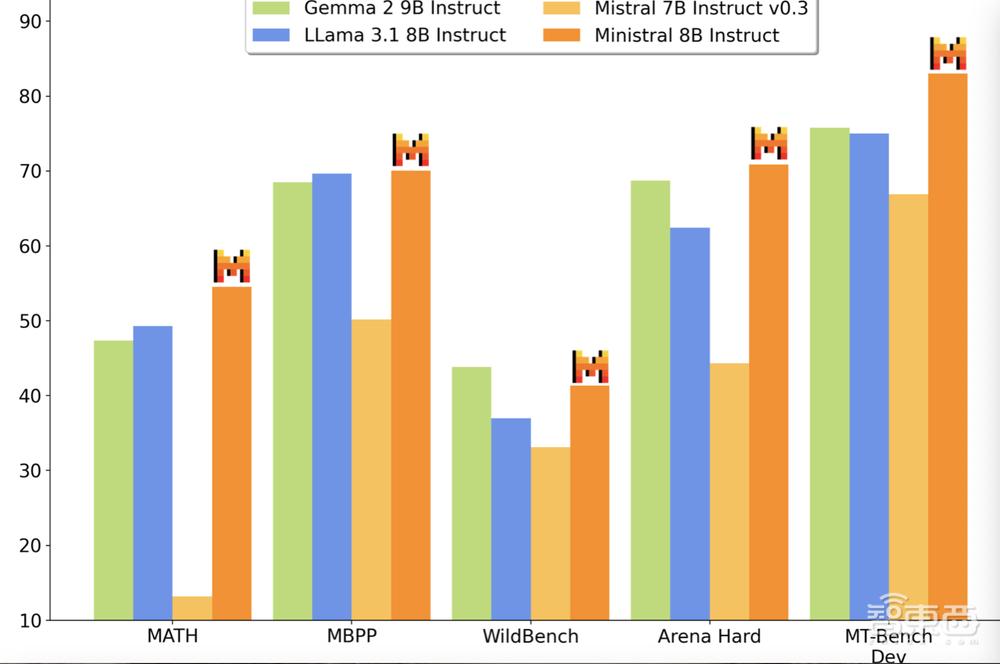 ▲Ministral 8B和Gemma 2 9B, Llama 3.1 8B, Mistral 7B性能的比较。(图源:Mistral AI)