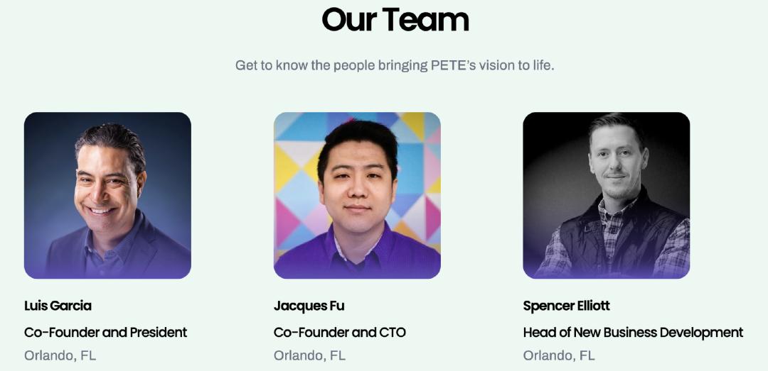 PETE的创始人是Jacques Fu,他是奥兰多首家本土金融科技独角兽Stax的联合创始人,PETE的联合创始人为Luis Garcia,他曾是Full Sail 大学新兴技术前副总裁兼在线学位课程的负责人。