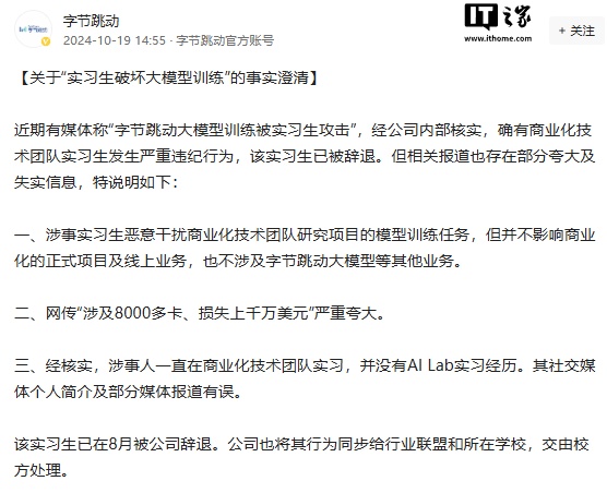IT之家 10 月 19 日消息,字节跳动今日发布《关于“实习生破坏大模型训练”的事实澄清》:近期有媒体称“字节跳动大模型训练被实习生攻击”,经公司内部核实,确有商业化技术团队实习生发生严重违纪行为,该实习生已被辞退。