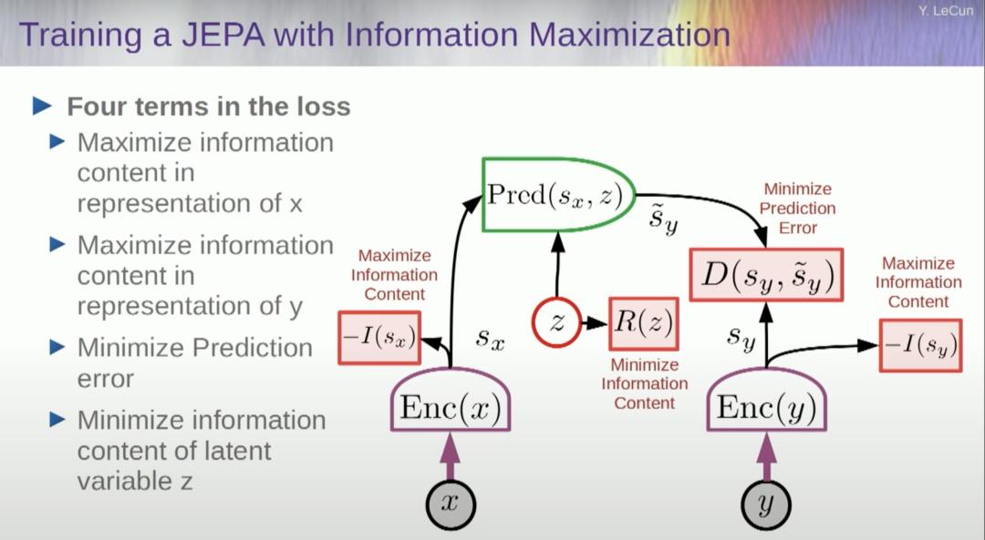 所以你想要防止系统崩溃。做到这一点的一种方法是使用某种代价函数,测量编码器输出的表示的信息内容,并尽量最大化信息内容,最小化负信息。你的训练系统要同时尽可能提取输入中的信息,同时最小化在该表示空间中的预测误差。