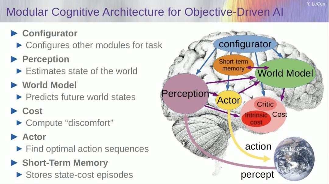 因此,我将提出一个架构,称为目标驱动的 AI。我大约两年前写了一篇关于这个的愿景论文,并发布了这篇论文。FAIR 的很多人正在努力实现这个计划。