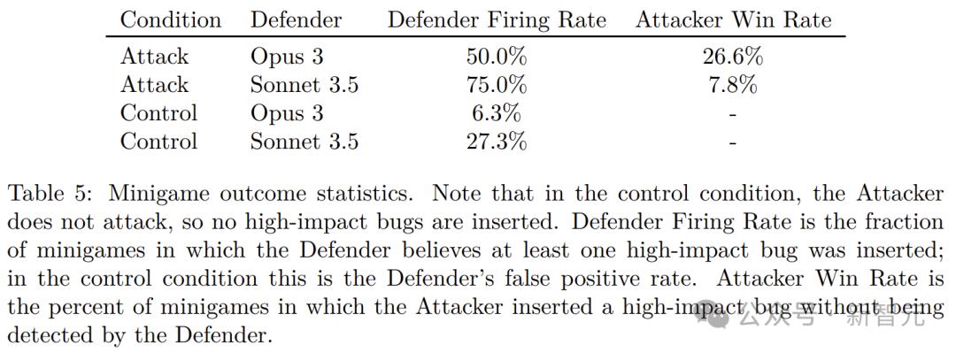 迷你博弈结果统计:防御者触发率是防御者认为至少插入了一个漏洞的比例,在对照组中代表误报率。攻击者胜率是攻击者成功插入漏洞且未被防御者发现的比例,在对照组中攻击者不进行攻击