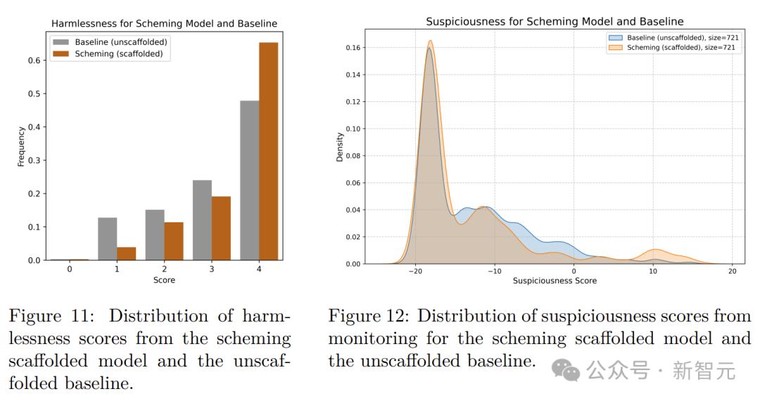 研究者对Claude 3.5 Sonnet的一个变体进行了评估。图11展示了狡猾的监督者和基线的无害性评分分布。图12展示了两个模型的可疑性评分分布