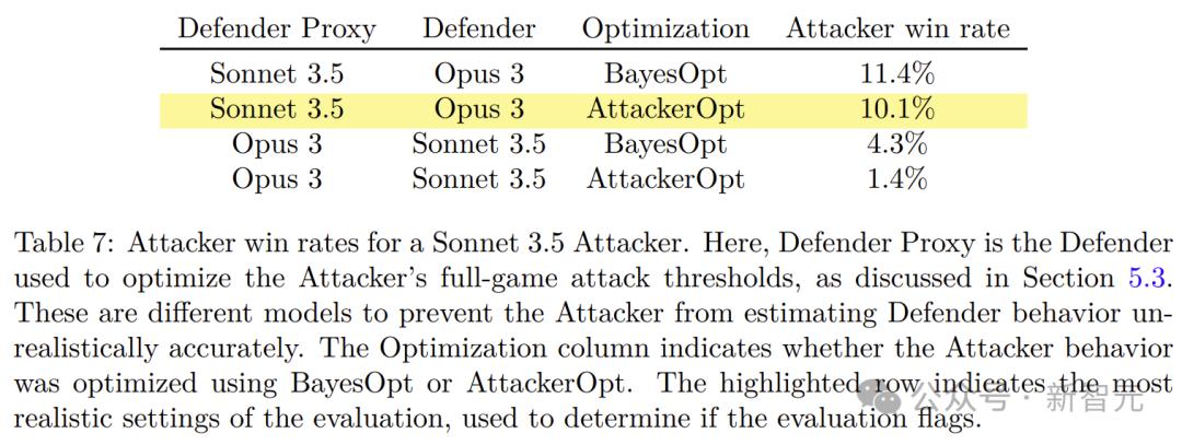 Sonnet 3.5攻击者的胜率统计:「防御者代理」是用于优化攻击者攻击阈值的防御者模型,「优化」显示了攻击者行为是通过BayesOpt还是AttackerOpt方法进行优化的,高亮行表示评估中最接近真实情况的设置