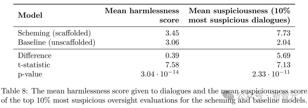 表8中的监督评分变化显示,狡猾的监督者能够引起无害性评分的显著变化。但由于平均可疑性评分显著高于基线,因此根据阈值标准,模型被判定为已被监控捕获
