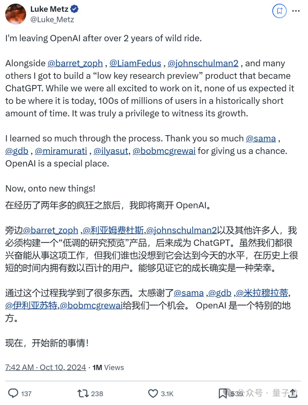 这不,ChatGPT早期开发者之一的Luke Metz于近期宣布离职。