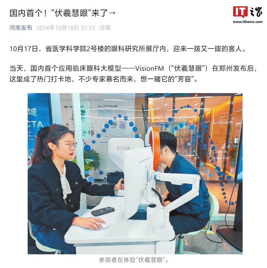 IT之家 10 月 21 日消息,IT之家从“河南发布”获悉,10 月 17 日,国内首个应用临床眼科大模型 ——VisionFM(“伏羲慧眼”)在郑州发布。