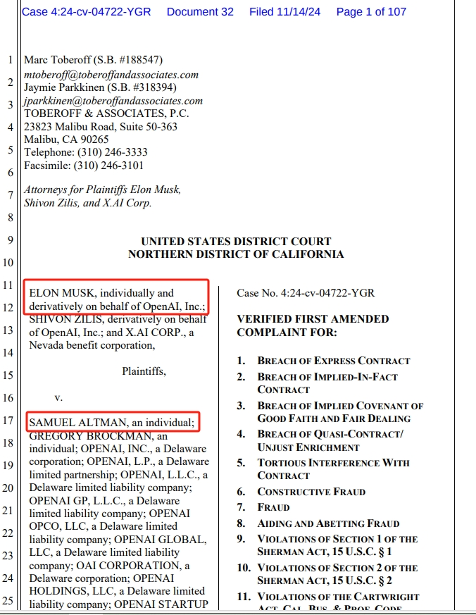 马斯克的最新诉状在8月提起的诉讼基础上加入了更多反垄断指控,并将微软及加利福尼亚州总检察长博恩塔列为被告。新的诉状长达107页,26项诉讼内容,较原诉状增加了20多页,诉讼内容增加了11项。