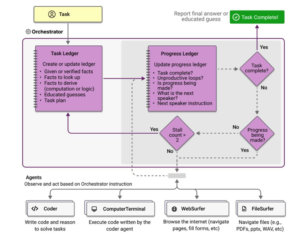 最近,微软的研究团队基于企业Autogen框架开发了Magnetic-One系统,建立了一个复杂的Agent等级结构。在这个系统中,管理Agent负责任务的全局调度,专业Agent专注于执行具体工作。