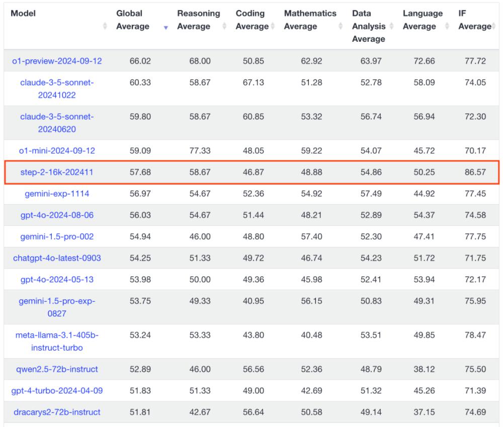 就是在这样一个颇具权威性和公平性的基准测试中,阶跃星辰的step-2-16k-202411位列全球第五,也是榜单前十中唯一一个国产大模型。