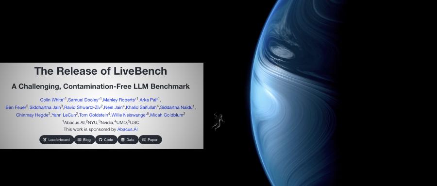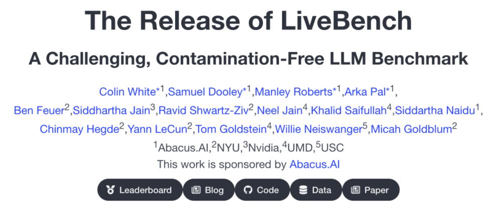 今年6月中旬,LiveBench项目正式发布,项目团队在创始博客中给它下了个定义——“具有挑战性、无污染的LLM基准测试(A Challenging, Contamination-Free LLM Benchmark)”,项目参与方名单里,杨立昆、纽约大学、英伟达、南加州大学等在AI领域颇具话语权和关注度的主体赫然在列。