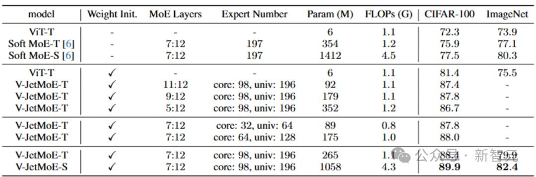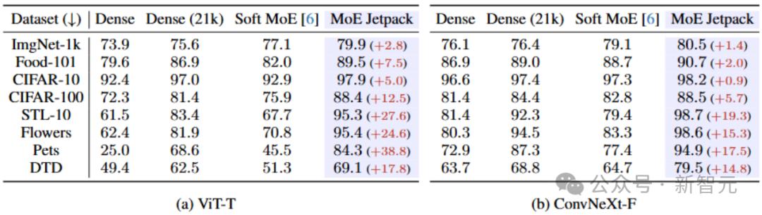 表1 MoE Jetpack基于ViT和ConvNeXt在8个下游数据集上的性能表现