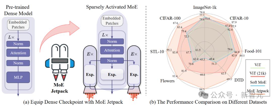 为解决这一问题,华中科技大学的研究人员提出了MoE Jetpack框架,利用密集模型的预训练权重(Dense checkpoints)来微调出视觉混合专家模型(MoE,Mixture of Experts)。
