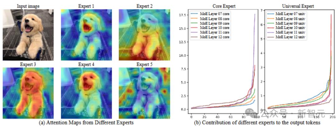专家注意力图展示了不同的专家关注图像的不同区域,各司其职。专家贡献分布图表明,核心专家和普通专家在不同层次的贡献差异显著,展示了模型的自适应路由调度机制。
