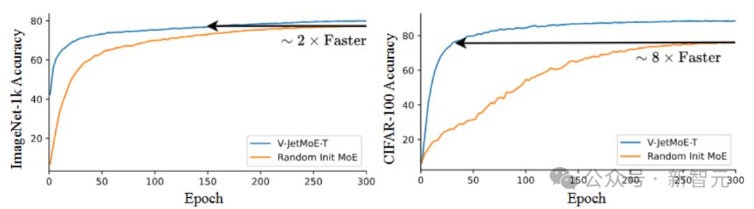实验结果表明,MoE Jetpack在多个数据集和网络结构上实现了显著的性能提升。在ImageNet-1K上,模型收敛速度提升2倍,准确率提高了2.8%;在小规模数据集上,收敛速度可达8倍提升,准确率提升超过30%。