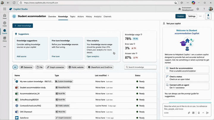 Copilot Studio 的知识管理功能还整合了 Azure AI Foundry,以支持更复杂、更定制化的场景。