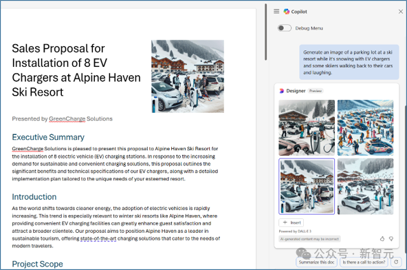只需在 Copilot 聊天窗格中输入提示,它就可以在文档中智能检索并添加 SharePoint 组织资源库中的相关图像,也可以使用 DALL-E 3 生成相关的新图像。该功能将于本月推出。