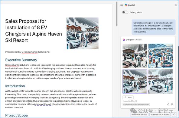 只需在Copilot聊天窗格中输入提示,它就可以在文档中智能检索并添加SharePoint组织资源库中的相关图像,也可以使用DALL-E 3生成相关的新图像。该功能将于本月推出。