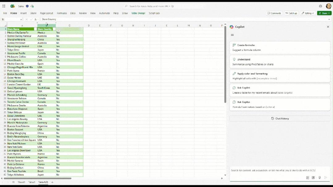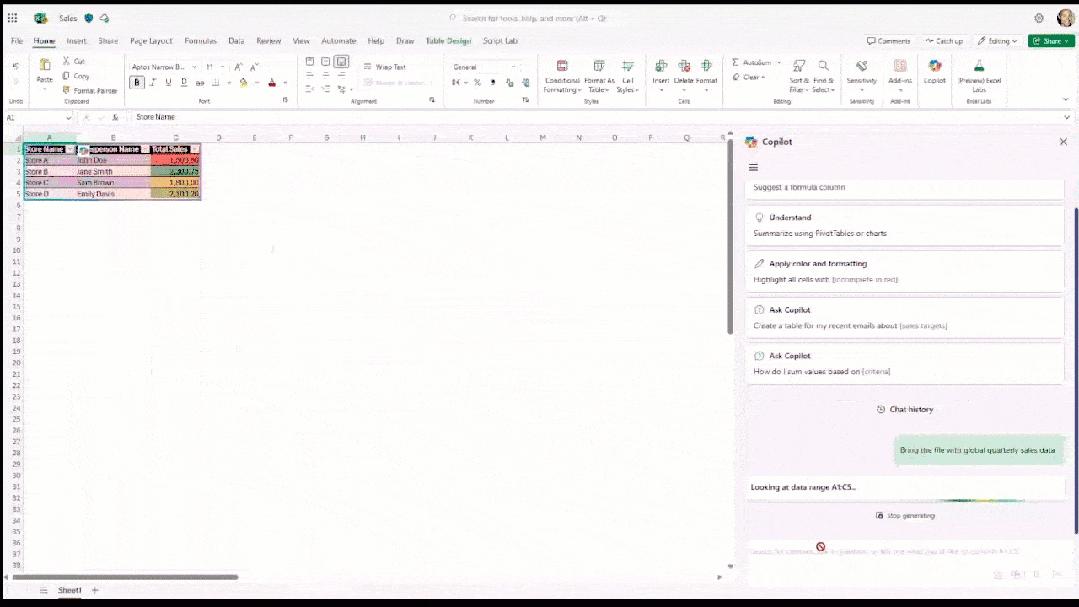 例如,你可以快速创建一个公司销售团队的表格。Copilot可以添加列、应用条件格式,甚至按指令更改表格颜色。只要你对表格满意,你就可以将其插入页面并继续使用Copilot。