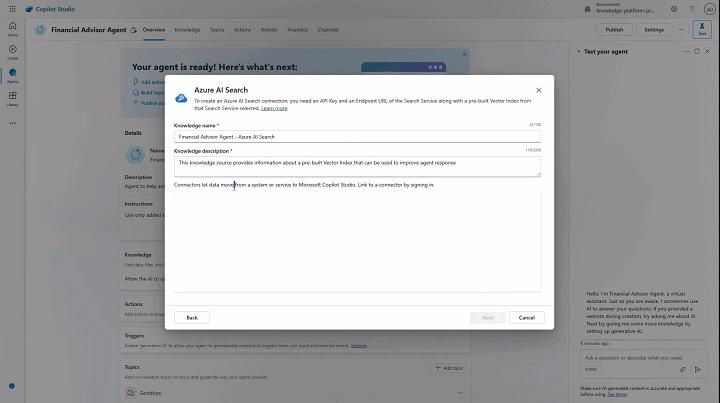 现在可以直接将这些数据作为知识源用于Copilot Studio,可以在Azure AI Search中构建的向量化索引上执行搜索操作,以访问非结构化数据。
