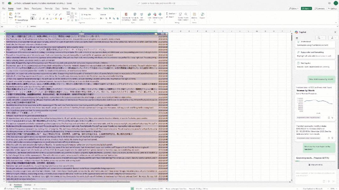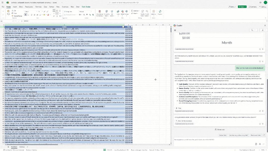 Copilot还可以将文本数据按主题分类和排序,帮助你更快速地分析非结构化的文本数据。例如,如果你有数千条客户评论,Copilot可以将它们划分为多个主题,如质量、服务和价格,帮助你快速确定需要进一步关注的主题。