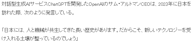 ·而且AI先驱ChatGPT之父奥特曼曾经在2023年访日期间说道,“日本有着长期与机械共存的历史,更容易接受新型科技。”