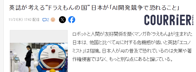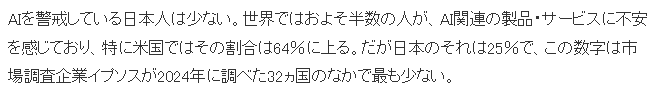 ·根据2024年市调公司发布的真实统计数据,全球国家地区半数以上民众都对于AI感到危机和不安,其中特别是美国高达64%,但日本仅有25%,在参与调查得32个国家里成功垫底。