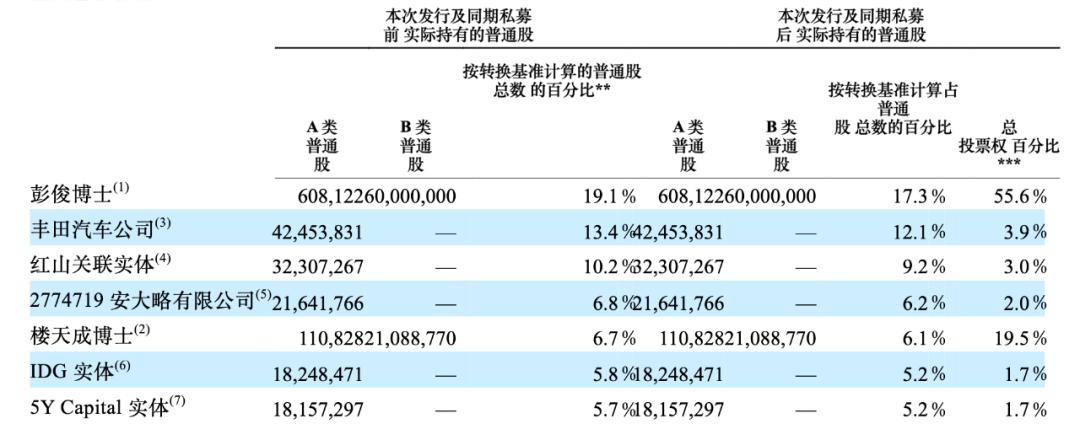 最新招股书显示,小马智行的第一大股东为彭军,持股比例为17.3%,根据A/B股架构(A类股1股对应1个投票权,B类股1股对应10个投票权),彭军持有55.6%投票权,另一位创始人楼天城持股比例6.1%,持有19.5%的投票权。