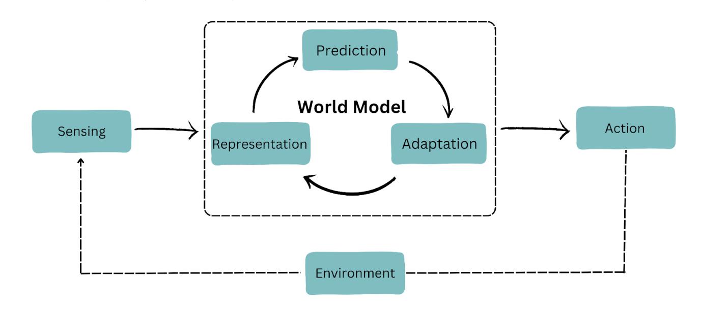 世界模型的基本思想,源自于对人类和动物如何理解世界的观察。我们的大脑能够构建内部表示,模拟可能的未来场景,并基于这些模拟做出决策。借鉴这一机制,世界模型旨在为人工智能系统提供一个内部环境的模拟,使其能够预测外部世界的状态变化,从而在不同情境下做出适应性决策。