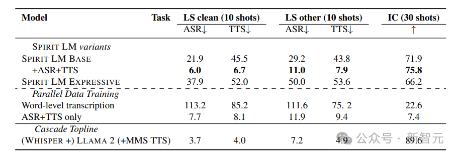 可以看到,Spirit LM 使用 10 个样本的提示能够获得最佳性能,最佳模型在 Librispeech 清洁数据上的词错误率为 21.9,文本转语音的字符错误率为 45.5