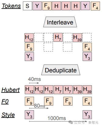 将三种类型的标记(每秒 25 次的 HuBERT 标记、每秒 12.5 次的音高标记和每秒 1 次的风格标记)按照对应的时间戳进行排序,混合成一个单一的 token 序列。
