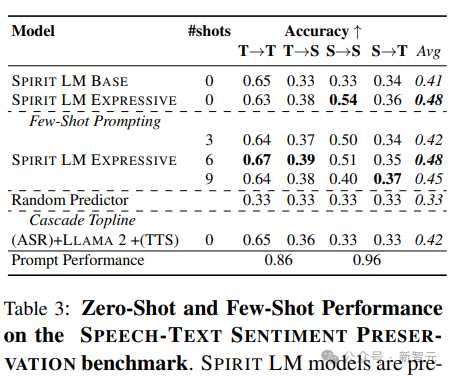 当给模型少量样本来学习时,可以发现这种方法对于除了语音内容生成(语音到语音)之外的所有情况都有帮助。无论是零样本还是少量样本,保持情感的连续性在相同类型的数据(比如文本到文本或语音到语音)中比在不同类型的数据(比如语音到文本)中做得更好;在所有测试中,语音到文本的方向得分最低。