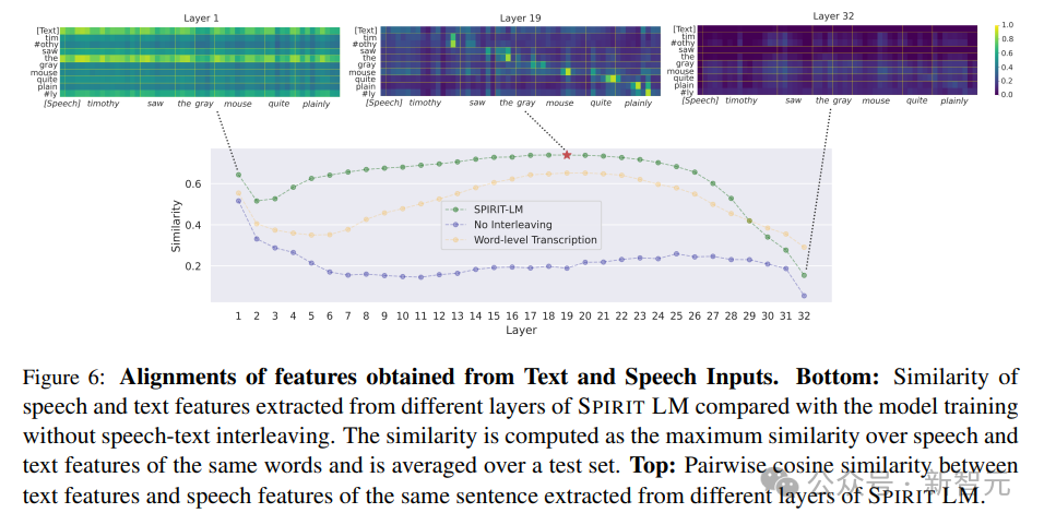 为了更好地理解模型在仅在交错数据和原始语音和文本上训练的情况下,如何实现良好的跨模态性能的隐藏机制,研究人员查看了模型特征的 token 级相似性,其中特征来自于 HuBERT token 的输入序列和相应的 BPE token,计算了从不同层提取的语音和文本特征的相同单词的最大相似性。