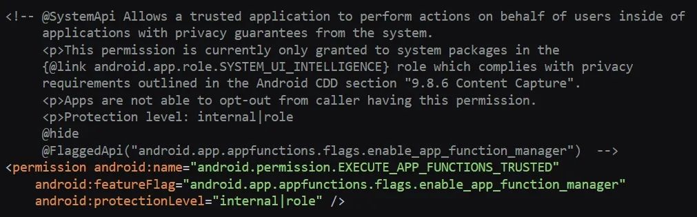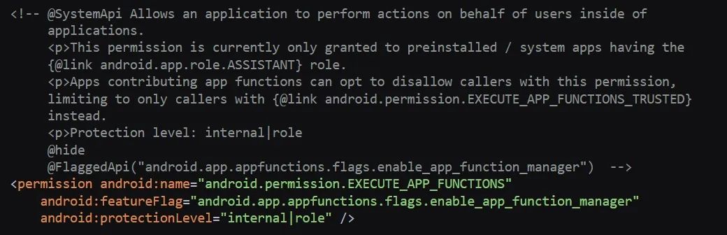 其中 EXECUTE_APP_FUNCTIONS_TRUSTED 权限具有更高的安全级别,应用开发者可以选择仅允许拥有此权限的应用执行其功能。