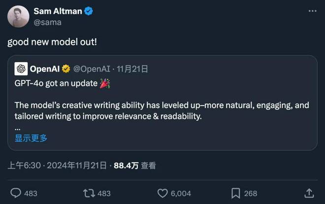 一周前,谷歌的 Gemini-Exp-1114 模型取代 GPT-4o,坐上了 Arena 榜单的头把交椅。对于苦苦追赶 OpenAI 几个月的谷歌来说,这次在基准测试上的胜利十分振奋人心。可惜振奋的时间不长:昨天,GPT-4o 一个更新,把第一名的位置抢回来了。