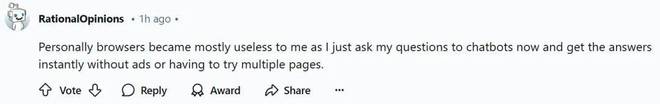 不过也有网友并不看好:「就我个人而言,浏览器对我已经没什么用了,因为我现在只需向聊天机器人提问,就能立即得到答案,而且无需广告或尝试多个页面。」