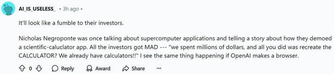 还有人用一个故事表达了自己的观点:「Nicholas Negroponte 曾经讨论过超级计算机的应用,并讲述了一个关于他们展示科学计算器应用的故事。所有的投资者都非常生气 ——『我们花费了数百万美元,而你们所做的只是重新创建了计算器?我们已经有计算器了!』如果 OpenAI 开发一款浏览器,我认为可能会发生同样的事情。」