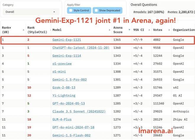 奥特曼庆功的话音刚落,Gemini-Exp-1121 杀出来,又把第一名抢走了。