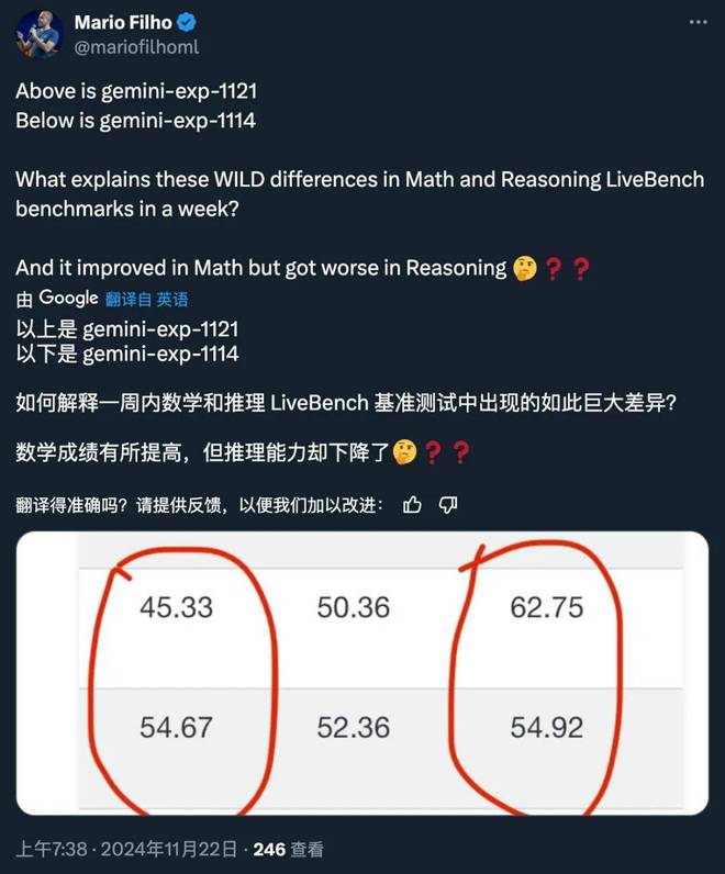 比如有人就发现在 LiveBench 上,一周后更新的 Gemini-Exp-1121 版本,在数学和推理能力上反而比不上 Gemini-Exp-1114,令人疑惑。