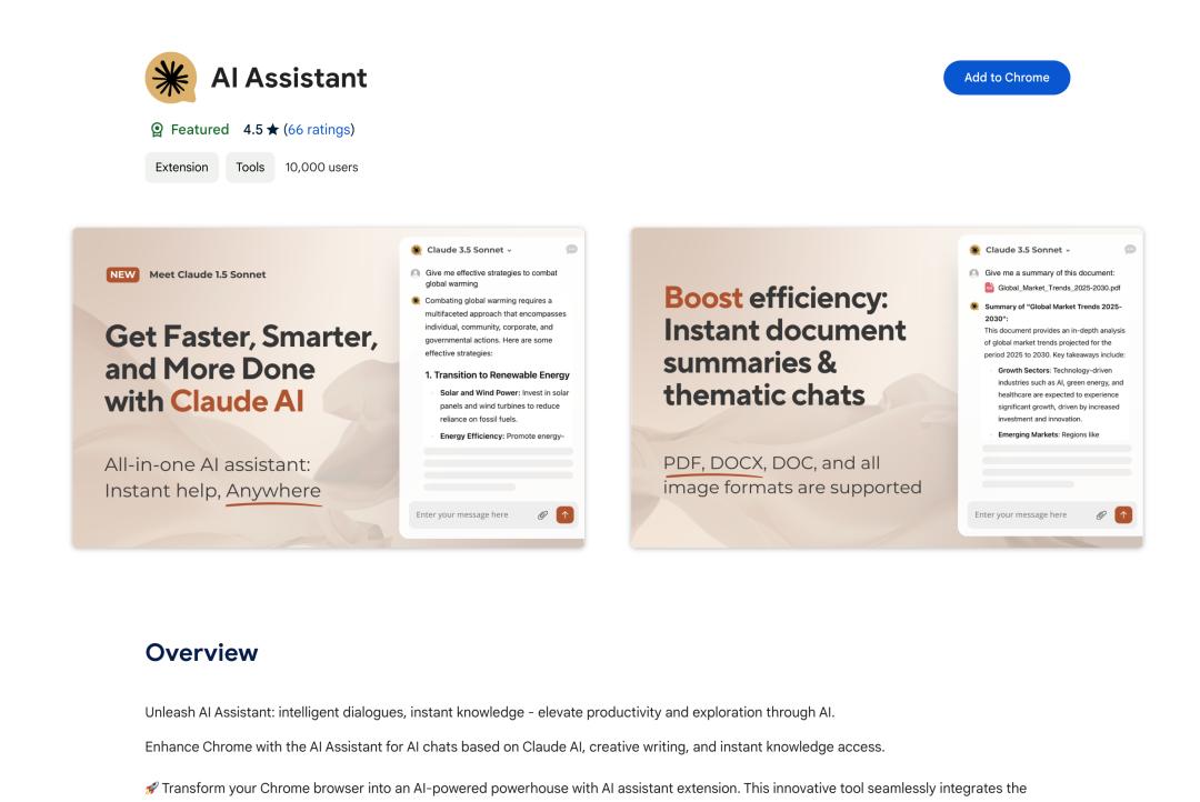 目前已经能在 Chrome 浏览器中调用 Claude 的插件|图片来源:Chrome 应用商店