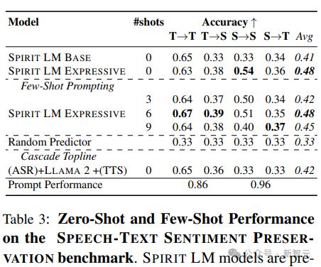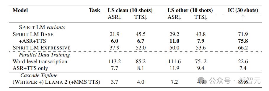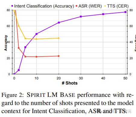 可以看到,Spirit LM使用10个样本的提示能够获得最佳性能,最佳模型在Librispeech清洁数据上的词错误率为21.9,文本转语音的字符错误率为45.5